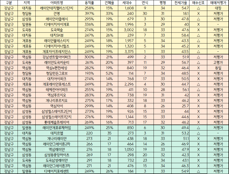 강남구 30% 이내 아파트의 현재 전세가율과 저평가 아파트를 확인하겠습니다
