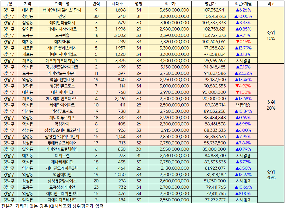 아파트실거래가(아실) 순위분석 툴을 활용하여 아래 기준을 적용한 아파트 중 평단가가 가장 높은 래미안대치팰리스 1단지를 기준으로 상위 30% 이내 아파트는 아래와 같습니다