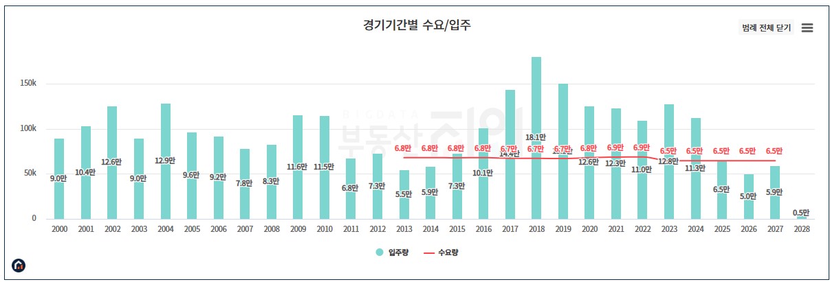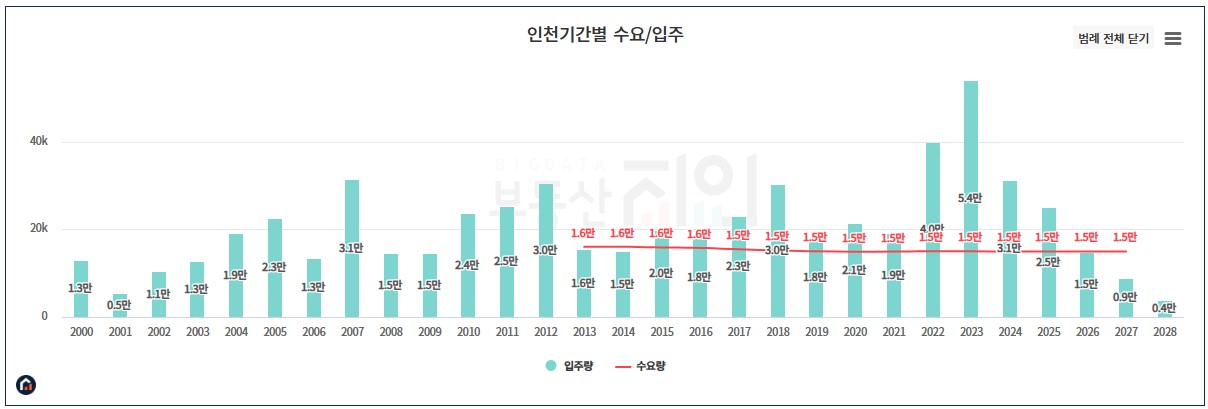 부동산지인의 수요/입주 데이터를 살펴보면 서울은 21년 이후, 인천은 26년 이후, 경기는 25년 이후부터 입주물량에 대한 리크스가 없다고 보입니다