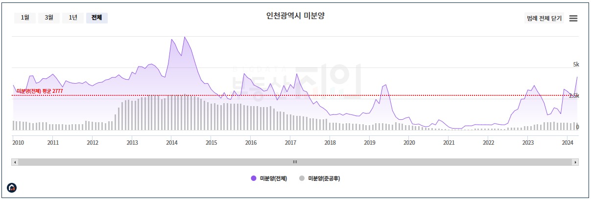 24년 1분기 기준 수도권 미분양률은 전체평균을 기준으로 서울 88% / 인천 96% / 경기 65%의 모습을 보여주고 있습니다 현재까지 평균 아래의 수치를 보여주기에 높다고 할 수 없지만 인천과 경기는 계속적으로 미분양이 늘어나고 있어 거래가 활발히 이루어지고 있다고 보기 어렵습니다