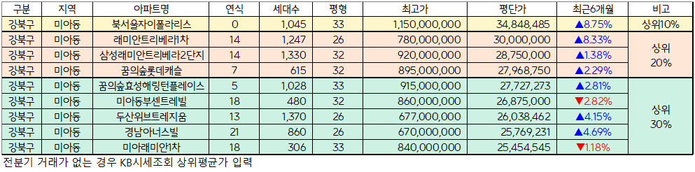 아파트실거래가(아실) 순위분석 툴을 활용하여 아래 기준을 적용한 아파트 중 평단가가 가장 높은 북서울자이폴라리스를 기준으로 상위 30% 이내 아파트는 아래와 같습니다