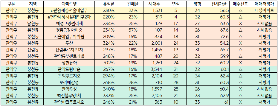 관악구 30% 이내 아파트의 현재 전세가율과 저평가아파트를 확인하겠습니다