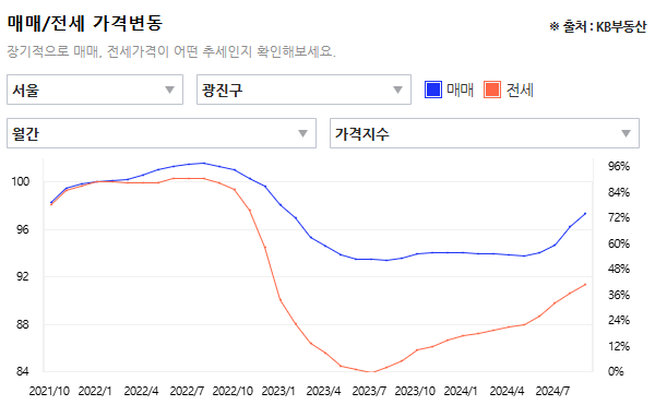 3분기 현재 광진구 전세지수는 23년 7월 이후 상승 / 매매지수는 24년 5월 이후 상승하는 모습입니다