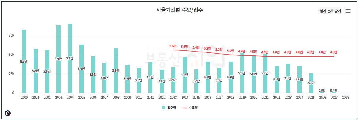 부동산지인의 수요/입주 데이터를 살펴보면 서울은 21년 이후, 인천은 26년 이후, 경기는 25년 이후부터 입주물량에 대한 리크스가 없다고 보입니다
